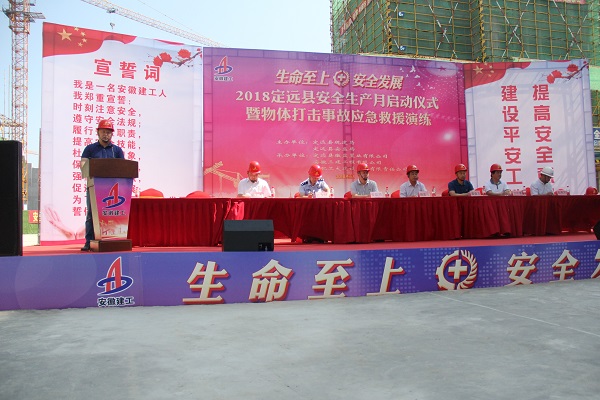 6月12日,定远县在徽盐曲阳现代城开展了以“生命至上,安全发展”为主题的2018年安全生产月启动仪式暨物体打击事故应急救援演练活动。县直相关职能单位规建局、安监局、公安局、卫计委等负责人、徽盐地产副总经理黎元忠、徽盐地产定远项目相关人员等出席了活动。